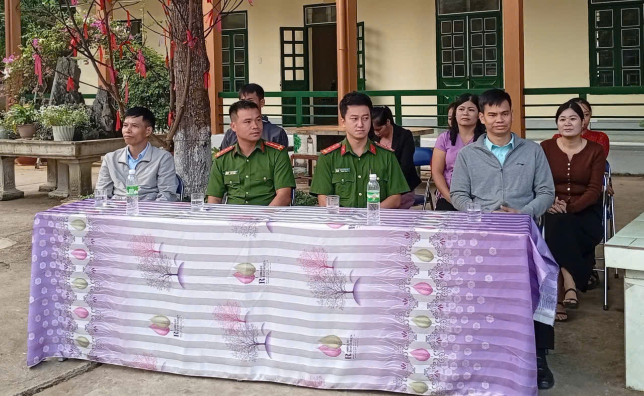 (Từ trái sang: thầy Phạm Trung Thành – Hiệu trưởng nhà trườngĐại úy Lò Văn Tân, Đại úy Đặng Ngọc Hải – Cán bộ Phòng Cảnh sát PCCC&CNCH Công an tỉnh Điện Biên, thầy Nguyễn Hồng Điển – Phó hiệu trưởng)