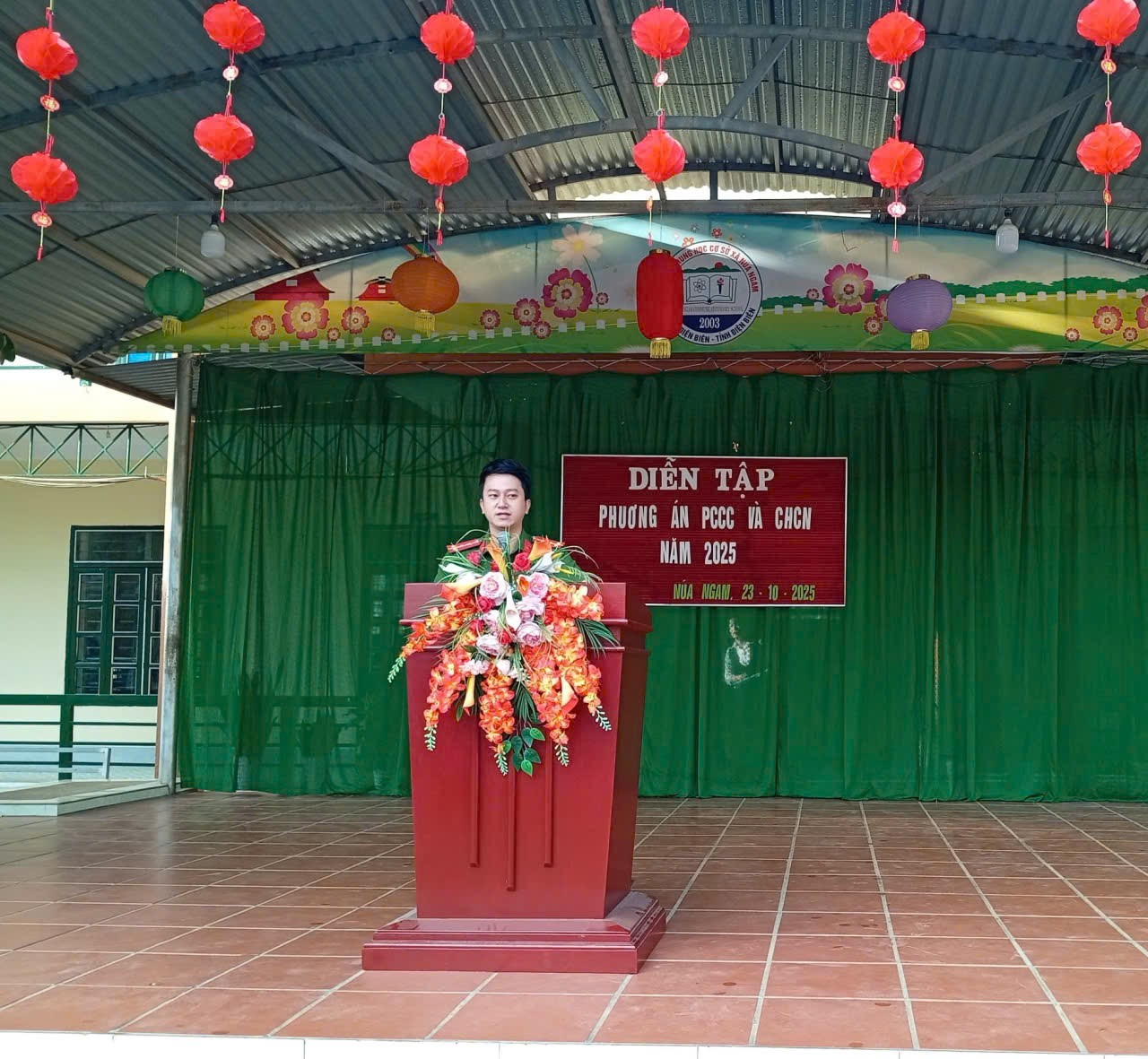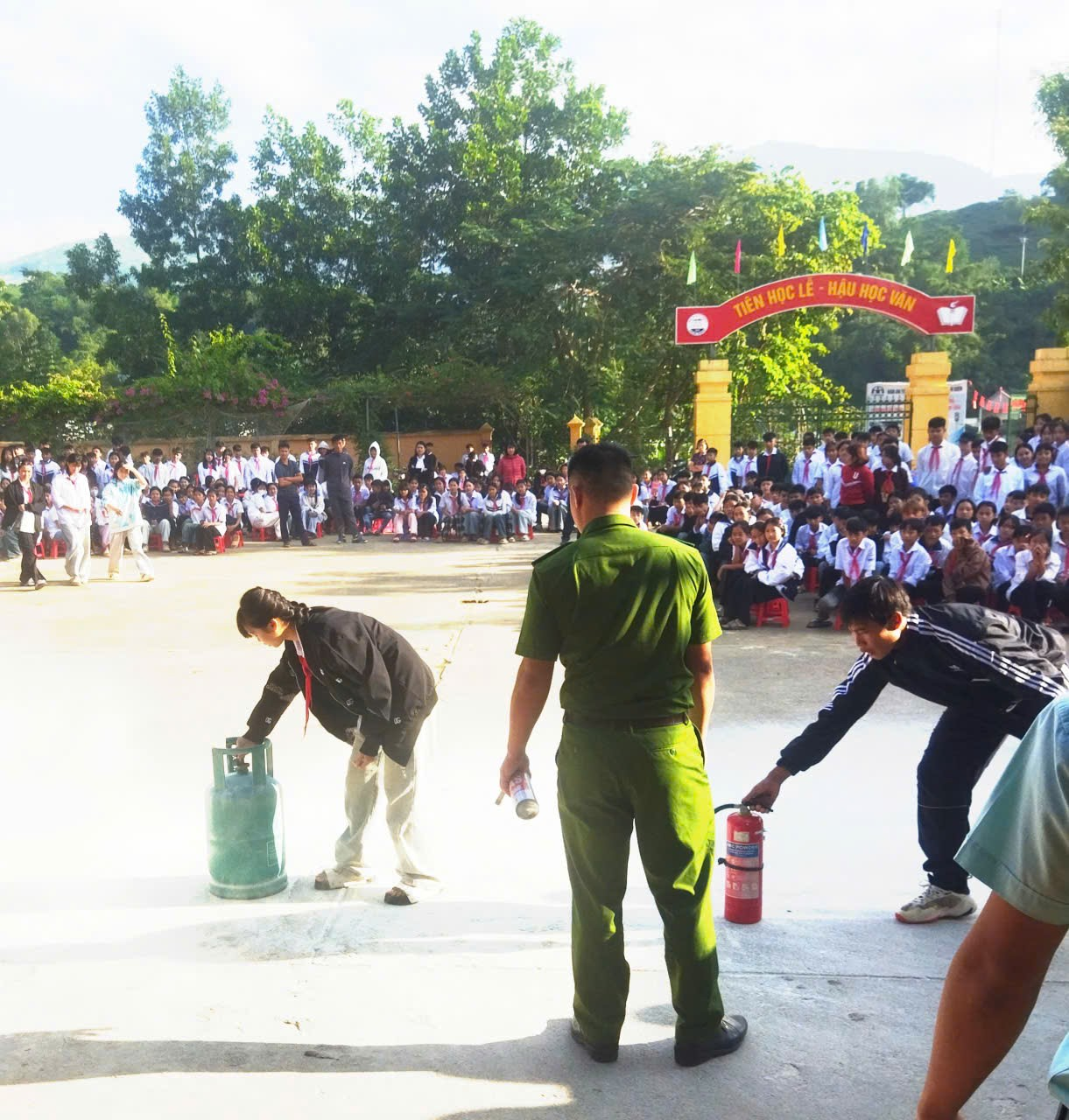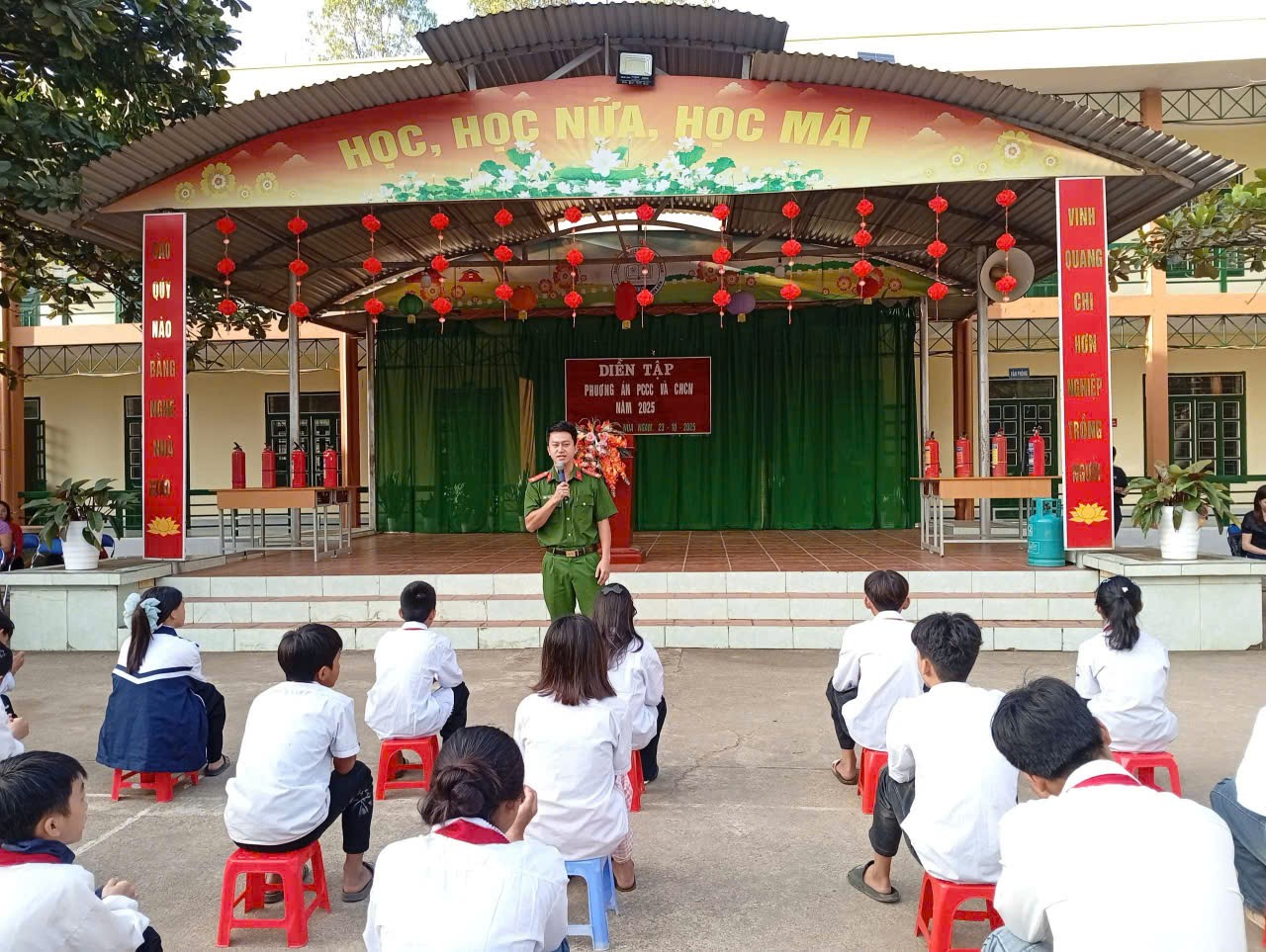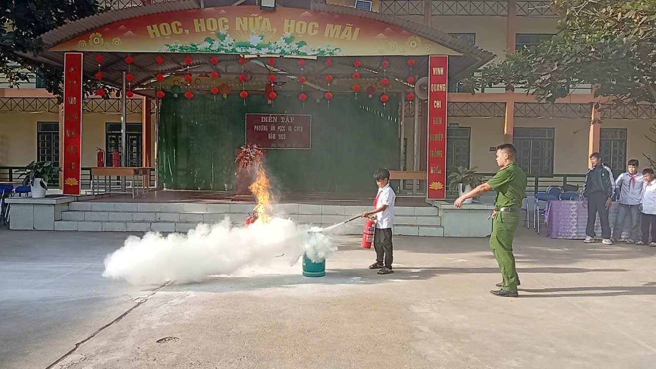 Mở đầu buổi diễn tập, Đại úy Đặng Ngọc Hải – Cán bộ Phòng PCCC&CNCH Công an tỉnh Điện Biên phổ biến kiến thức, kĩ năng cơ bản về PCCC& CNCH tới toàn thể cán bộ, giáo viên, nhân viên và các em học sinh. Các kiến thức, kỹ năng trọng tâm bao gồm: Khái niệm và mức độ nguy hiểm của sự cố cháy, tầm quan trọng của việc nhận biết sớm và xử lý ban đầu khi có cháy nổ xảy ra; Kỹ năng thoát nạn an toàn trong từng tình huống như ở nhà, những nơi đông người (trường học, trung tâm thương mại, siêu thị, bệnh viện,…); Các bước chữa cháy; cách phân biệt, bảo quản và sử dụng bình chữa cháy bột và bình chữa cháy khí.