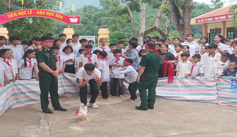 Sau phần thi hóa trang là trò chơi “Bịt mắt đánh trống” và “Bịt mắt bắt vịt” – hoạt động được mong chờ nhất của các em học sinh. Những trò chơi, giúp các em học sinh được sống trong không khí tưng bừng của các lễ hội dân gian. Những tiếng hò reo cổ vũ vang dội, tiếng cười rộn rã khiến cả sân trường như vỡ òa trong niềm vui. Trò chơi không chỉ mang lại tiếng cười mà còn là dịp để các em thể hiện sự thông minh và khéo léo. Hòa cùng không khí vui nhộn của các trò chơi, các cán bộ, chiến sĩ đồn Biên phòng Mường Nhà cũng đã nhiệt tình tham gia trò chơi “Bịt mắt bắt vịt” cùng các em học sinh. Khoảnh khắc các chú bộ đội trong màu xanh áo lính, bịt mắt đua tài tìm bắt chú vịt cùng các em học sinh đã mang lại những tràng cười sảng khoái, không chỉ cho các em học sinh mà còn cho toàn thể phụ huynh và giáo viên, tạo nên một không khí vô cùng gần gũi, ấm áp. Đây không chỉ là một trò chơi mà còn là dịp để tình cảm quân - dân thêm gắn bó, thể hiện sự quan tâm, sẻ chia của các cán bộ, chiến sĩ Đồn Biên phòng Mường Nhà đến đời sống tinh thần của các em thiếu nhi vùng biên. Tiếng reo hò, cổ vũ náo nhiệt đã làm nóng bừng cả sân trường, chứng minh rằng Trung thu thực sự là ngày hội của tình đoàn kết và niềm vui.